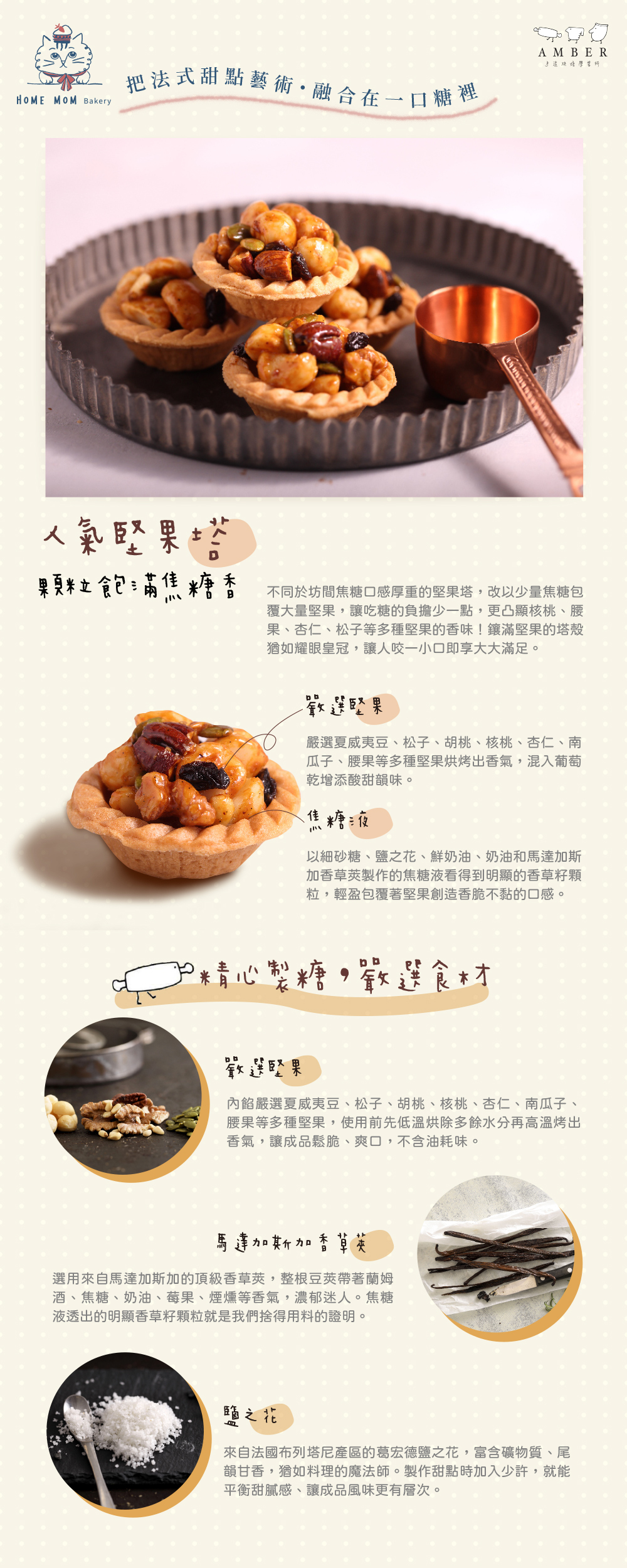不同於坊間焦糖口感厚重的堅果塔,改以少量焦糖包覆大量堅果,讓吃糖的負擔少一點,更凸顯核桃、腰果、杏仁、松子等多種堅果的香味!鑲滿堅果的塔殼猶如耀眼皇冠,讓人咬一小口即享大大滿足。