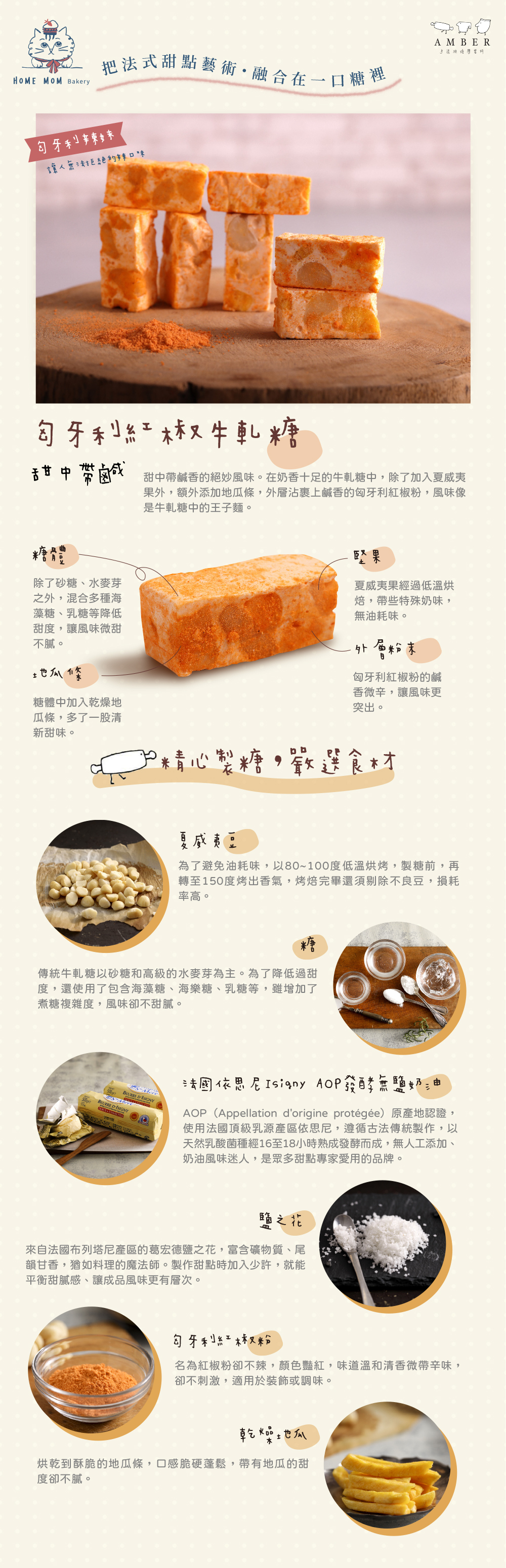 甜中帶鹹香的絕妙風味。在奶香十足的牛軋糖中,除了加入夏威夷果外,額外添加地瓜條,外層沾裹上鹹香的匈牙利紅椒粉,風味像是牛軋糖中的王子麵。