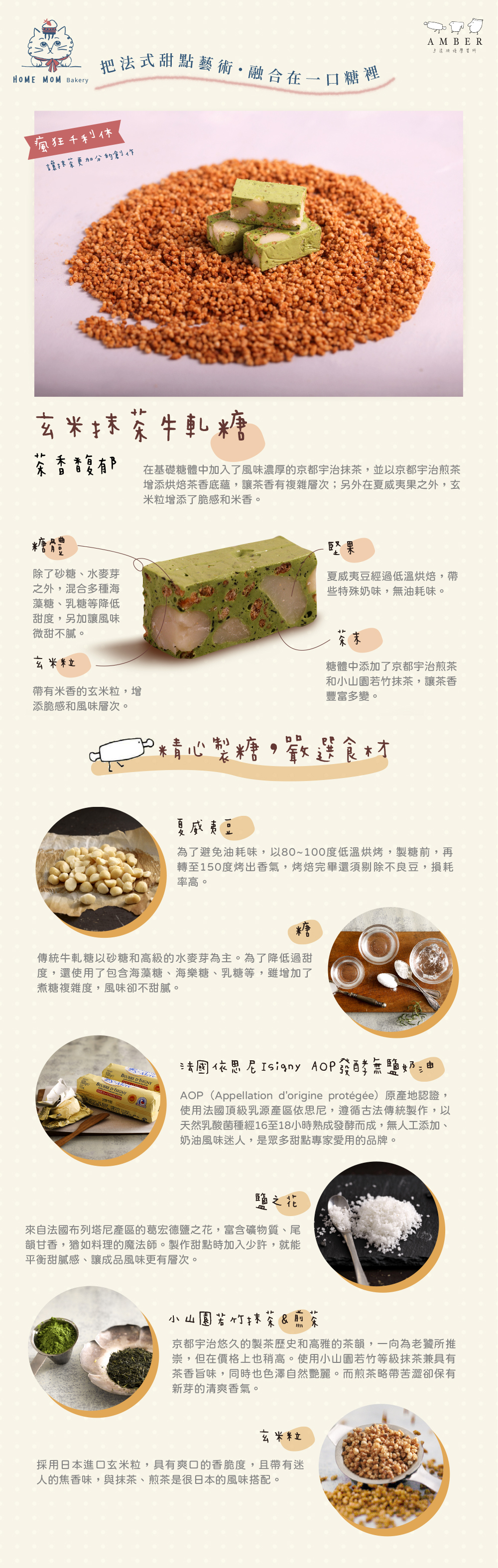 在基礎糖體中加入了風味濃厚的京都宇治抹茶,並以京都宇治煎茶增添烘焙茶香底蘊,讓茶香有複雜層次;另外在夏威夷果之外,玄米粒增添了脆感和米香。