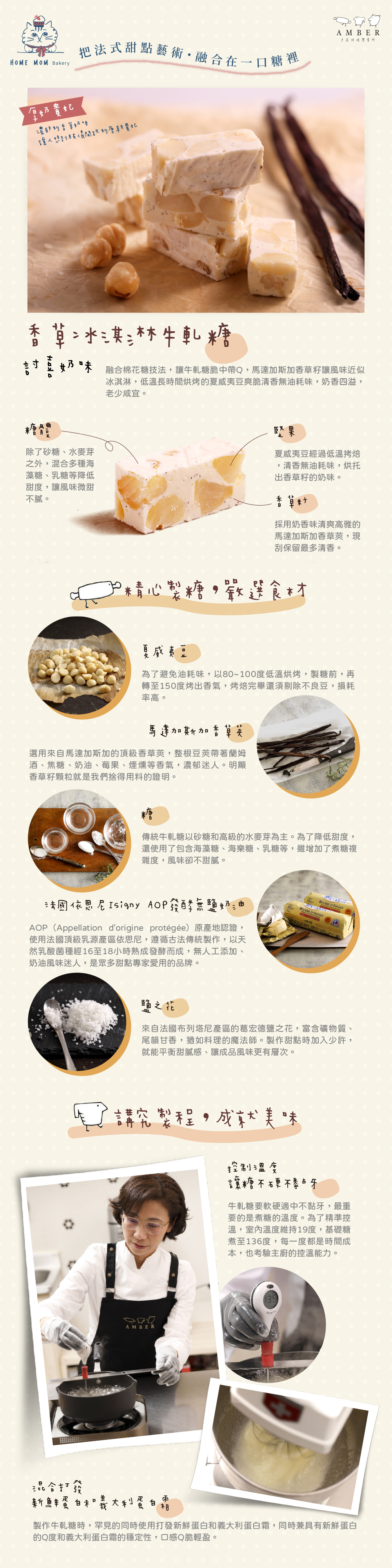 融合棉花糖技法,讓牛軋糖脆中帶Q,馬達加斯加香草籽讓風味近似冰淇淋,低溫長時間烘烤的夏威夷豆爽脆清香無油耗味,奶香四溢,老少咸宜。