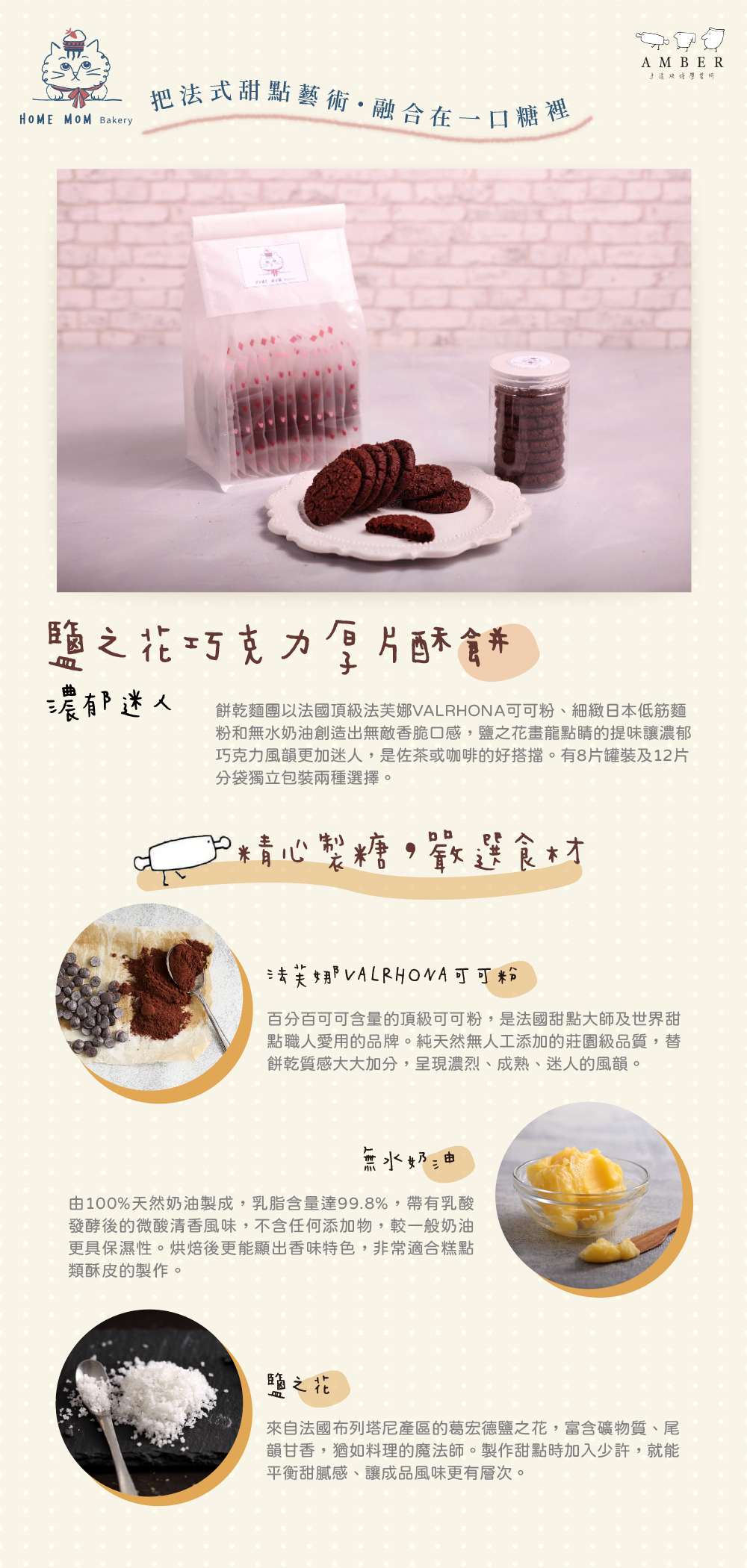 餅乾麵團以法國頂級法芙娜VALRHONA可可粉、細緻日本低筋麵粉和無水奶油創造出無敵香脆口感,鹽之華畫龍點睛的提味讓濃郁巧克力風韻更加迷人,是佐茶或咖啡的好搭擋。有8片罐裝及12片分袋獨立包裝兩種選擇。